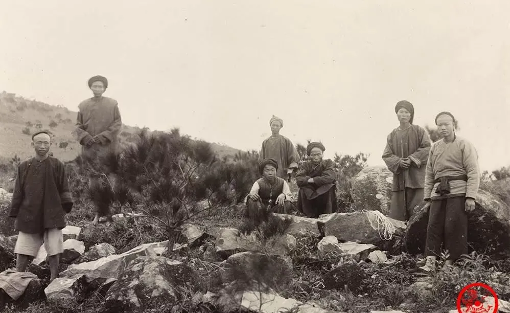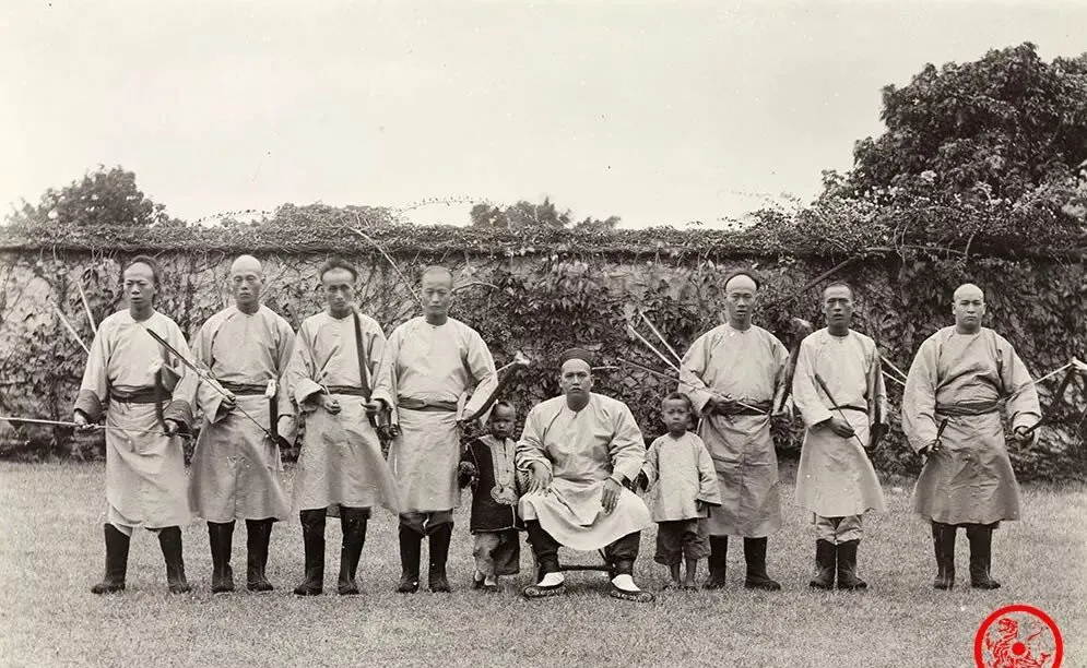 摆拍这组照片的,是晚清武考里的弓箭手,刀枪弓箭全家伙带全了,布靴扎脚,短褂宽袖,有的神情严肃,有的半蹲半站,背后的篱墙上爬满爬山虎,这种武装队伍,在那时还算体面差事,