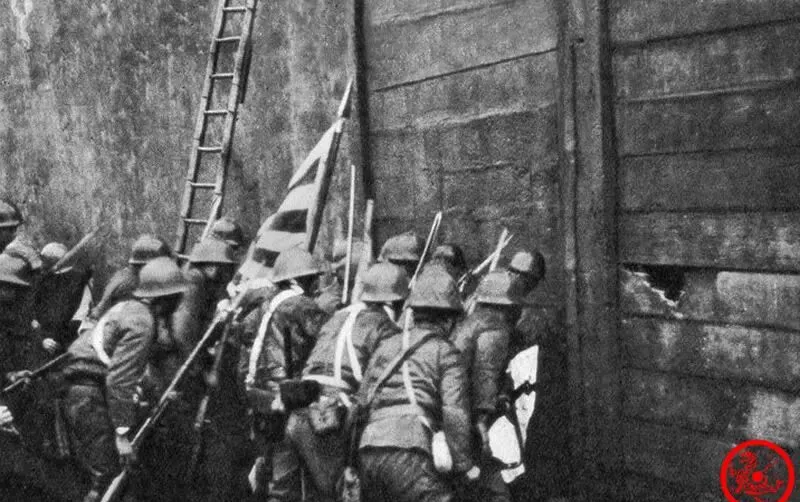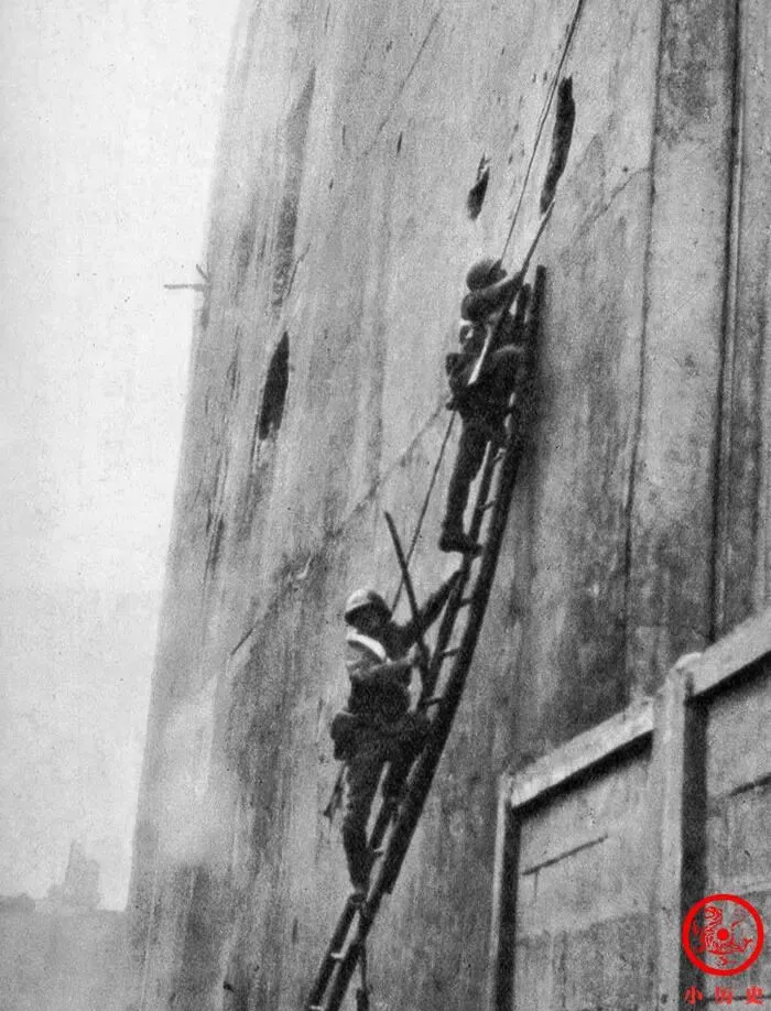 这张里能看到墙下竖着梯子,几名军人攀着残破的水泥墙往外爬,没谁闲着,肩头扛着枪,有的腰间还别着备用弹药,也看不太清,但墙面赫然几个大弹孔,料想夜里外头一直炸,墙体摩着摩着都掉粉,地底下早就软成土,后来有老人说:那时小鬼子一连挖地雷,人走着怕脚底下“轰”一下,拍的正是那股急逃命的感觉。“全凭无线电里一声令,谁脚下都不敢软”,我爷爷当年当兵,说士兵逃生时全队谁也不敢乱看一眼后头,人心都在跳
