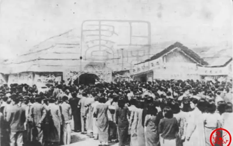 这个场面比前头还大,密密麻麻的都是送殡的人群,有的甚至爬到房顶上要看灵柩,挤得透不过气,远远拉开的帘子上又是几条毛笔对联。老一辈感慨,**“谢团长拼命,百万人送”,这样的场面,现在想想都有点不敢信了,哪怕大明星,谁还能有这派头
