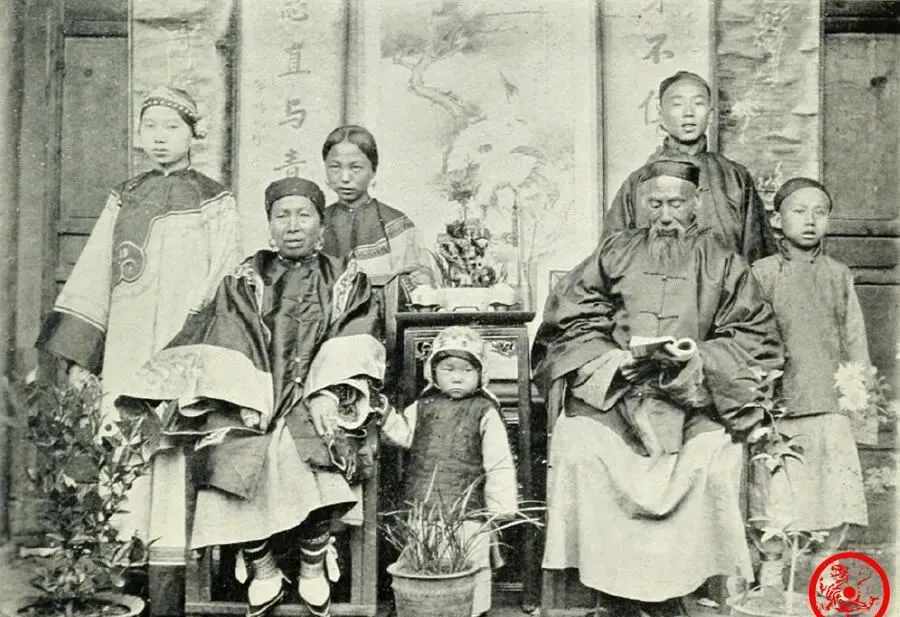 图中坐成一排的,是个富贵人家,男的一身绵衣、帽子带顶子,面上有点官气儿,剩下仨小辈模样的大多是他的孩子,椅子大靠背,手上一圈毛边,尽显讲究,那会儿要是一般人家,根本不敢随便坐拍照。