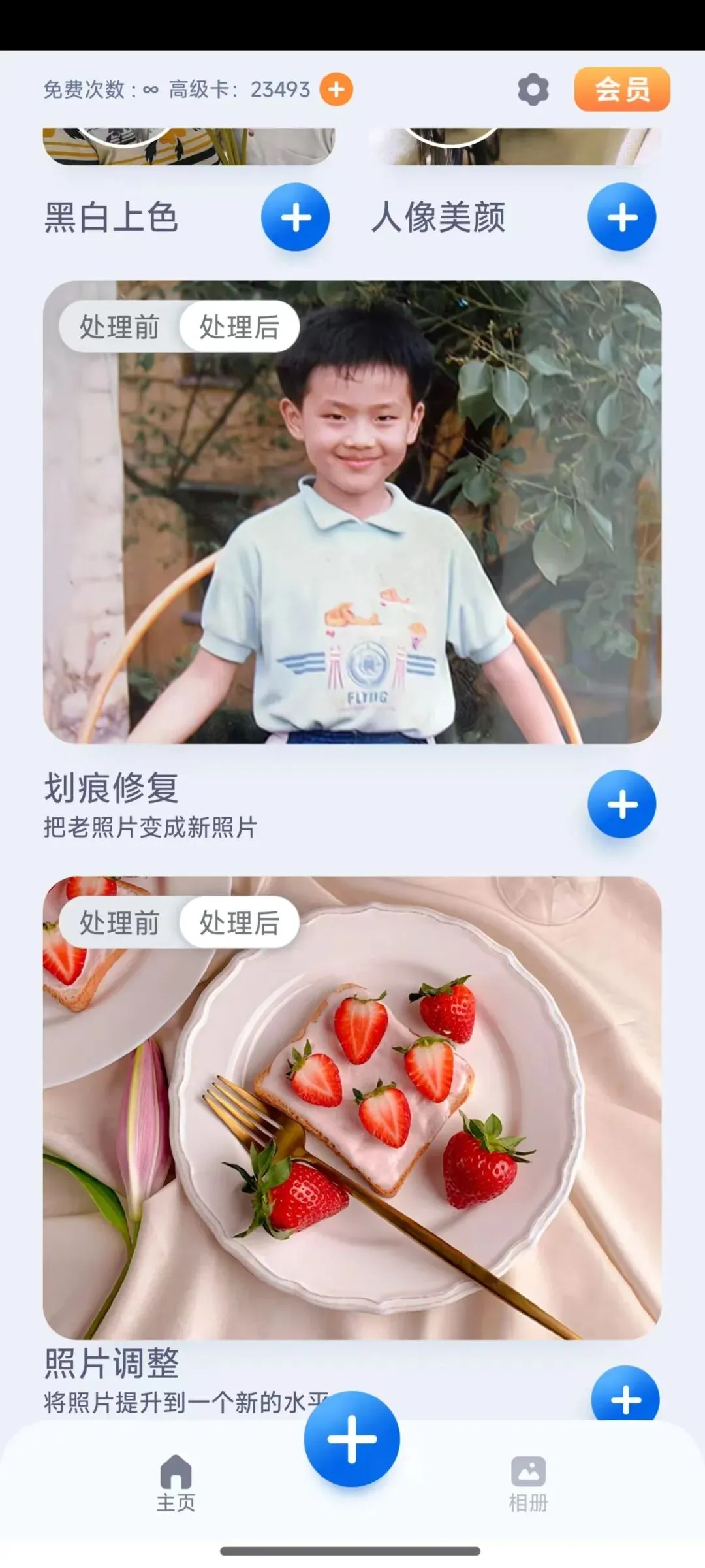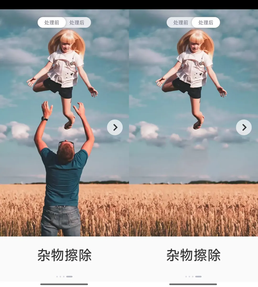另外还有个杂物去除和背景虚化的功能,照片里多余的东西可以直接清掉,背景也能一键虚化,这些小功能平时可能用不太上但是需要的时候还真挺方便的,照片色彩增强也可以试试,那种暗淡发灰的老照片处理完之后会鲜艳通透很多,观感提升不少,