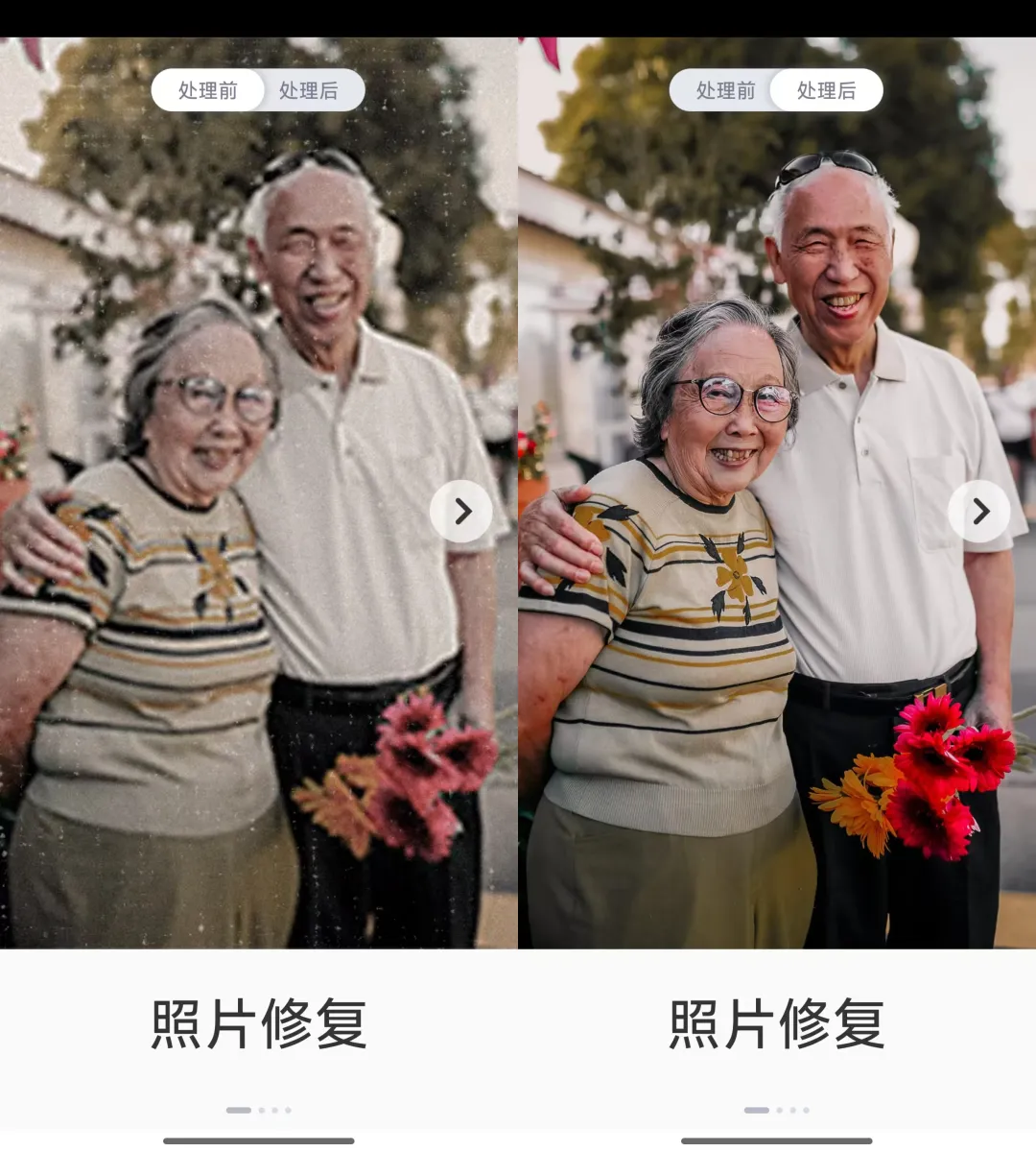 划痕修复针对那种有折痕或者破损的老照片,处理效果也不错,省得专门花钱找人修了,人像美颜的话,斑点瑕疵什么的一键就能去掉,简单粗暴,