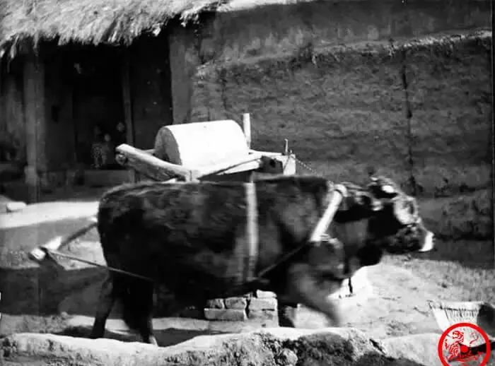 照片正中间站着头壮牛,脖梗子套着木轭,身后连着石碾,牛不急不慢地绕着圈走,石碾轧得咕噜噜直响,玉米棒子、麦粒都挤在碾盘里搅成碎末,印象里最有戏的是牛走一圈,人蹲一角捡漏,小时候站牛屁股后头看热闹,娘喊“小心脚下别打滑”,年代不同,现在城市娃连牛样都难见,这种粗活多被电机什么替了,奶奶说“牛是家里的力气,碾是地里的收成”,那劲道,这年头只剩念叨。