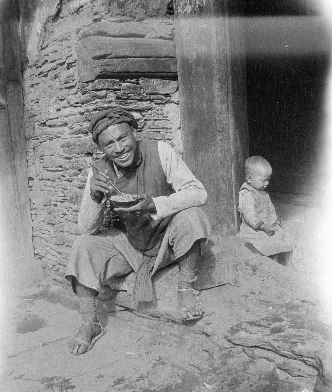 图中穿着长衫,头裹抹额的汉子,端着碗蹲在门口大声笑着,脚上草鞋,裤腿半卷,一脸风霜,说不定碗里就是窝窝头蘸点咸菜,孩子坐在边上低着头不吭声,这种官寨大门厚实,石墙堆得险,里面人日子过得比外头宽裕点,可转身还是得靠自己,过日子谁能图个容易。