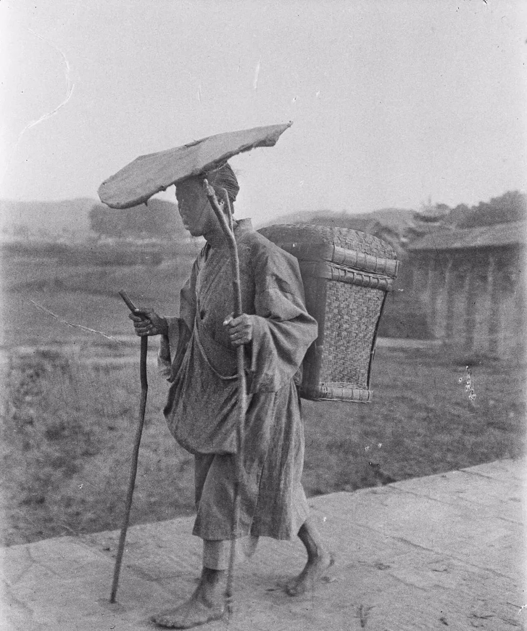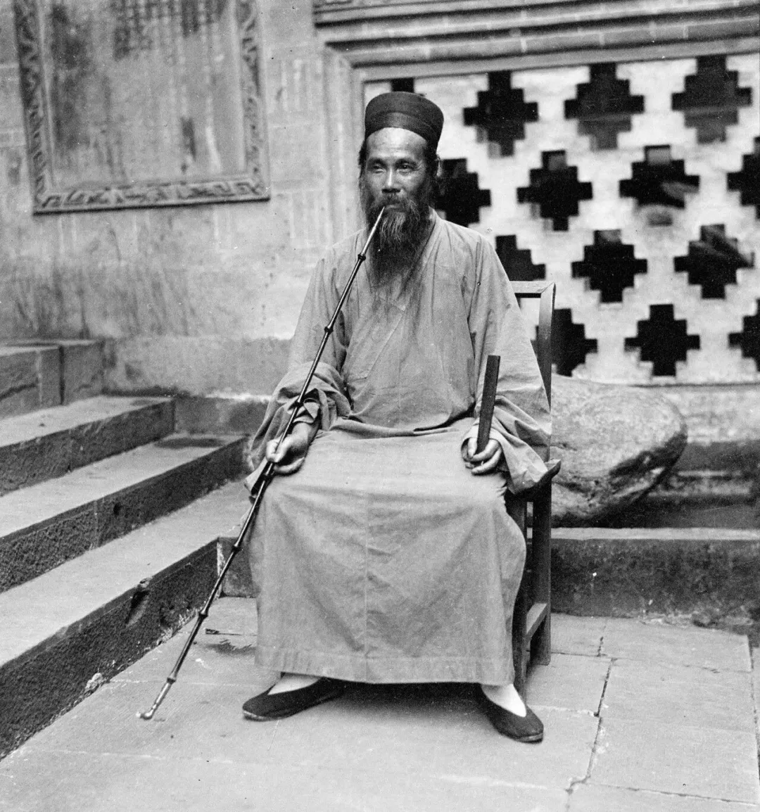 图中这位坐得笔直的就是灌县的道士,披着长袍大袖,头戴高帽,手里不离烟杆和那把纸扇,胡子花白,神情倒也安然,院子里地砖擦得打光,常常有人进来请他算一卦问个好歹,爷爷以前遇见道士总说,“真先生在庙外,道士在民间,求人问事找他们,一分香火钱能混个打卦”,那时候兵来兵走,人生天命全托付给这些老手艺,神神叨叨地,百姓寻一点心理安稳。