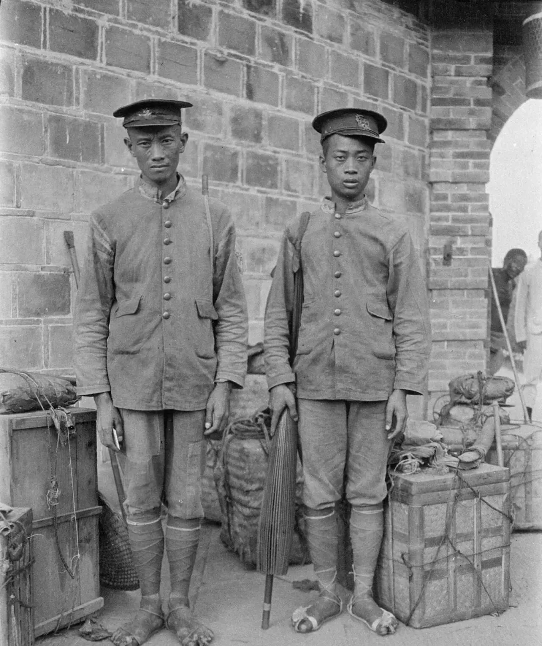 这两位身穿窄袖制服,站得直直的,是军阀混战年间的四川兵勇,军衣褪了色,裤脚上还缠带布条,脚上倒是露着脚趾的草鞋,旁边堆满了行李和麻绳,有的人手里还卷着把伞,那阵子四川征兵算不上啥稀罕事,前门拉走的儿郎,转眼后门就只剩下一句老母亲的叹气声,村里谁家男人不在外东奔西跑的,可现在哪还见过这光景。
