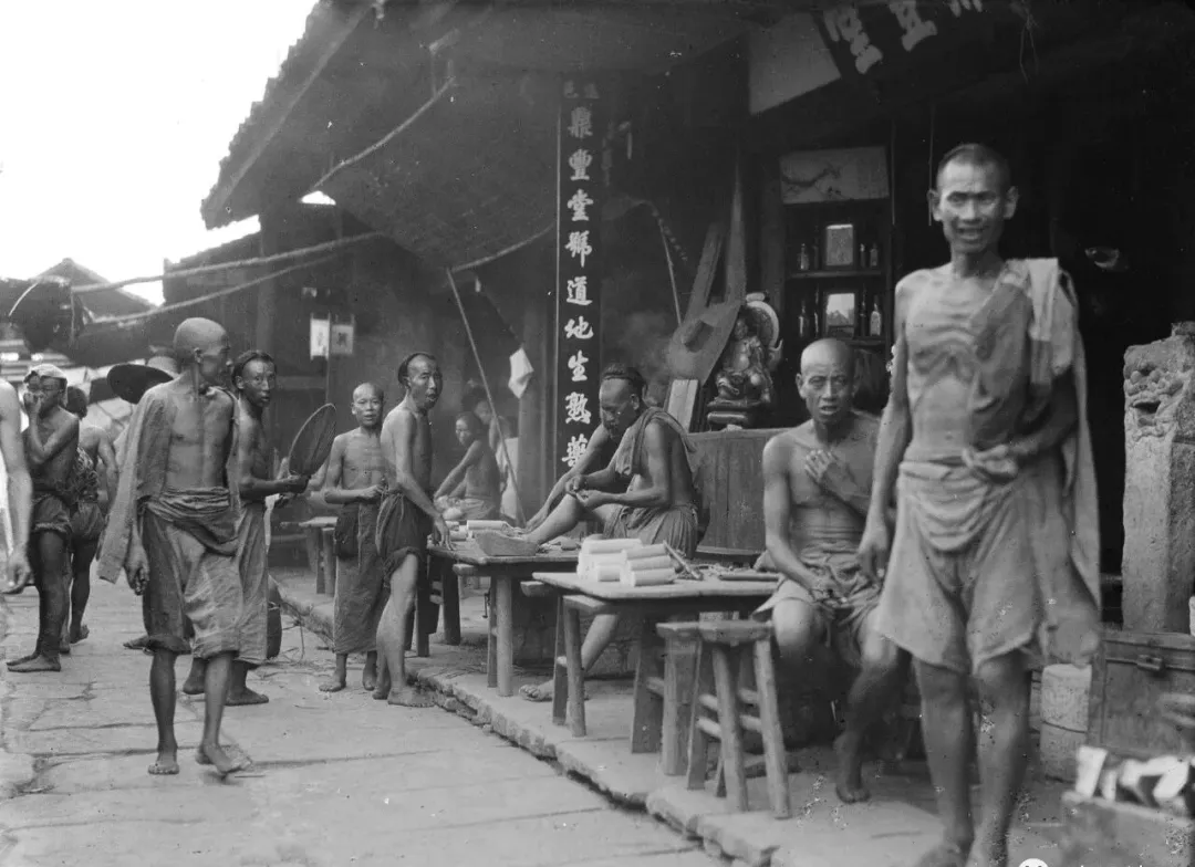这张照片上,人全都赤膊而行,街上的地砖脏兮兮的,大家脚下没鞋,裤管卷得老高,不少人脑后还拖着条清朝遗风的长辫子,天一热,家里头也没冰箱啥的,光着膀子就凑合了,那时候靠手挣饭,衣裳烂点糊补下还能撑住,倒是屋子旁边一溜摊子,烟火气里透着日子的苦劲儿。
