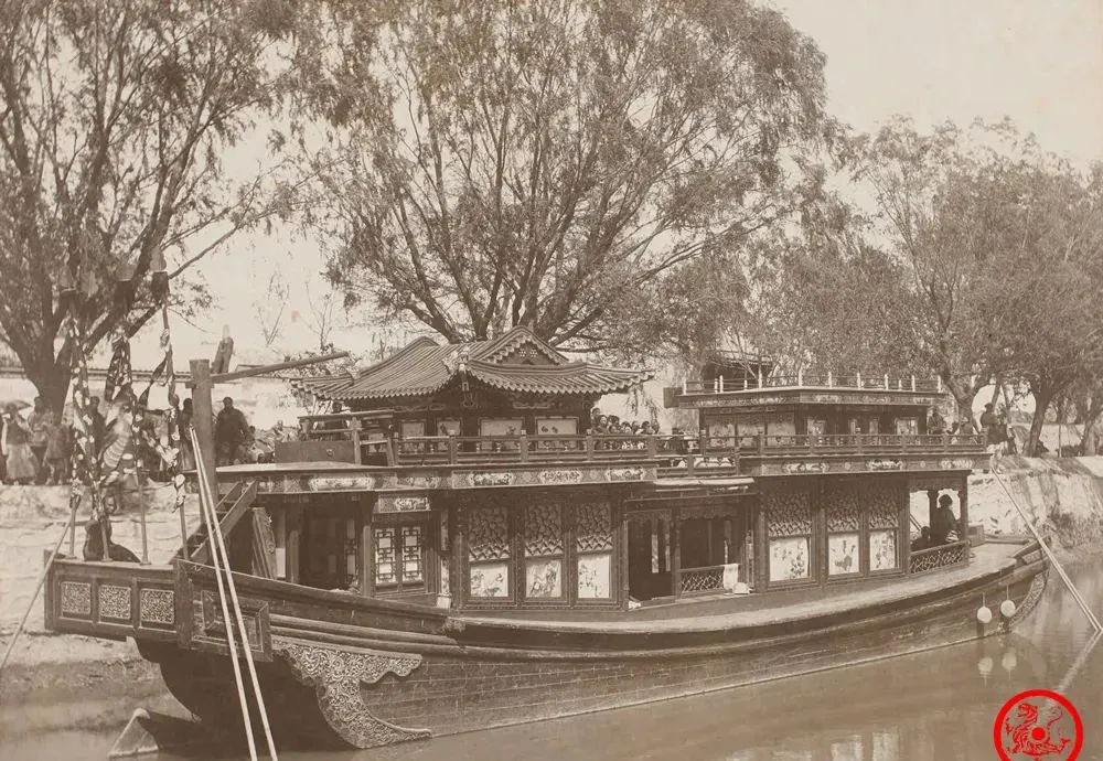 这个船叫皇家御船,逢着慈禧太后在紫禁城、颐和园来回奔,是这船拉着行李和仪仗队顺着长河一路过来的,外观看着花哨,屋檐、雕窗不输宫殿,里层舱板上描着画,阳光一打能看到时光留下的暗影,小时候家里长辈提起过,说那个年代想搭个小船都不让,还别说碰这大家伙,隔着岸,看大船进出,一水的规矩走,谁敢差池半步呀,画里的慈禧太后,日常办公、游玩,就靠这条船折腾。
