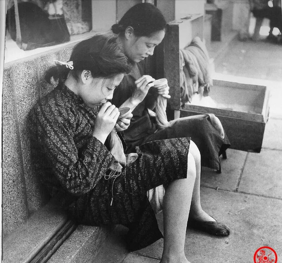 图里的这对母女,坐在街角水泥台阶上,膝盖楼起头埋着,手里一团淡色纱巾,上下翻着卖,袖子老早磨得发亮,边上摆了个小木箱,也就那么点家底,穿的是碎花夹衣,小姑娘低着头,像在细细检点什么,脸色瘦褪掉份量,目光里全是急切和倦意,不问也知道,这点小买卖能挣几个钱,够不够家里一顿菜饭,谁都心里没底。