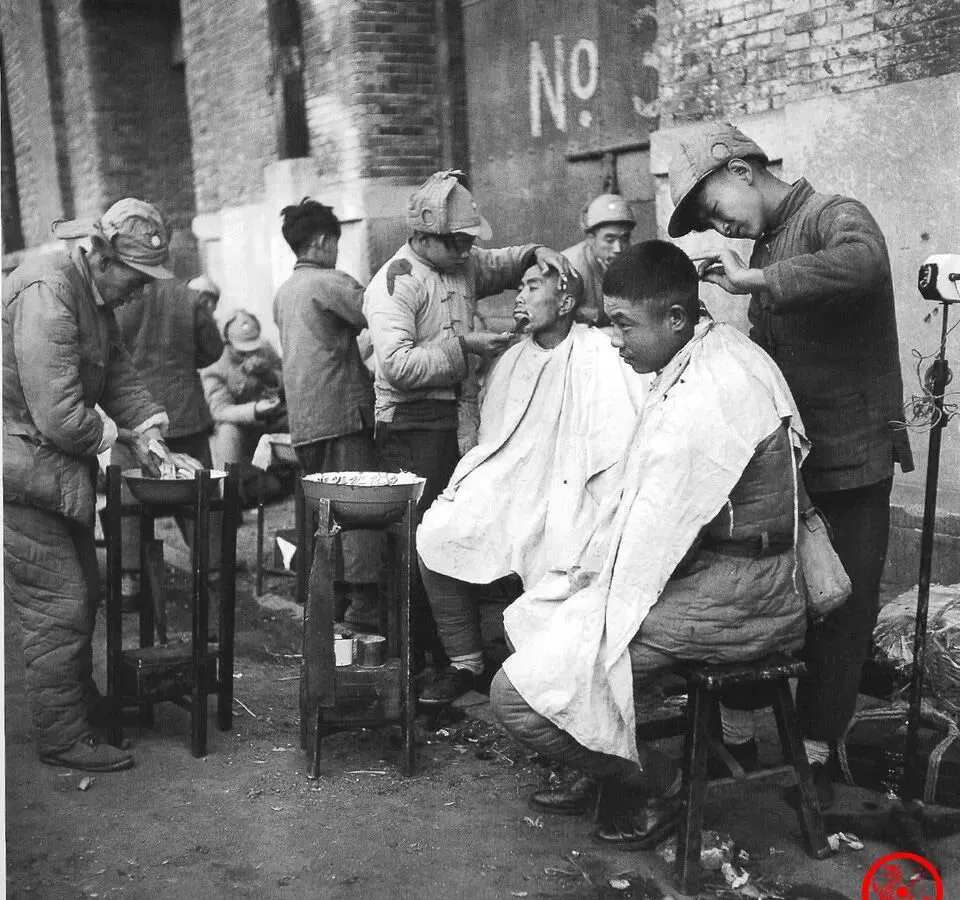 这个场景热闹,几张小马扎一字摆开,人挤着蹲下等剃头,穿的是棉军装,头盔松松搭着,师傅一只手按着脑袋,一手挥着刮刀,盆子里搁点热水,肥皂一搅白沫就冒出来,剃完头的兵,胳膊肘撑着腿,目光落地上也不说话,有的旁边扒拉剩饭,这样的兵一直走在城里也怪不是味道,东家不管西家不认,看惯了,外人也就懒得多问一句。