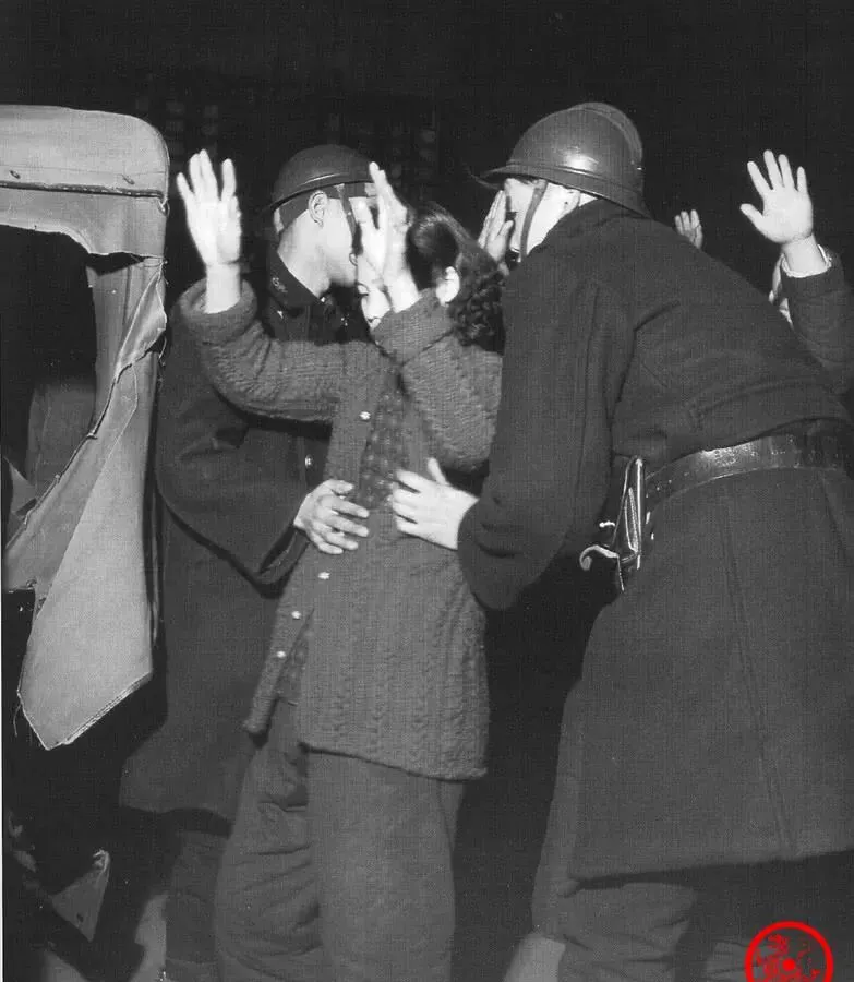 这张照片里的汉子,坐在警车里把脸遮住,一个捂着流血的脑袋,一个侧身压着手,看得出来是刚挨过打,旁边警察手握橡皮棍,神情满是防备,这种时候混乱中多的是三教九流,一招不慎脑袋开花,天天都在演,以前是青皮,现在是苦力,总还是要吃饭,日子逼着人变样。