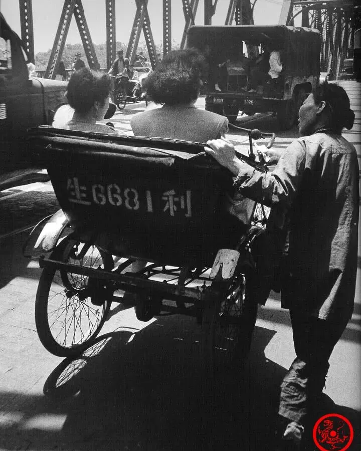 人力车夫推着带篷三轮,后头坐着两个女人,一个头被烈日晒着拿手遮,车夫掮着膀子往前蹬,阳光斜挂在桥栏上,上海滩风光没了,桥上多的是等活路的人,皮包骨头踩着踩着也看不见明天是什么模样,我爸当年说,饿得没力,还得咬牙把客人送到码头,回来看一眼家里的锅,叹口气“活着就不错了”。