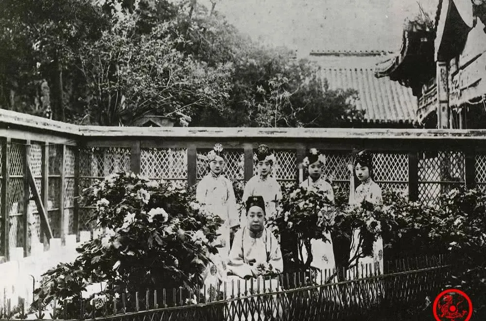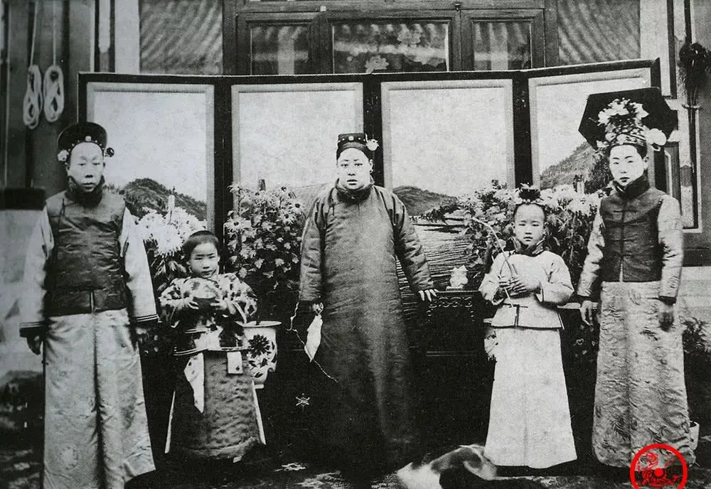 头一张就是这宽袍大袖的摆阵,宫装压得人挺直脊梁,瞧这中间的瑾妃,脸庞没什么特别,连妆容都显素净,不像戏文里唱的贵气逼人,身边几个侍女和小姑娘站得老实,个头有高有矮,表情没一丝波澜,屏风上大束菊花装点,反倒多出一份人间气,“宫里人多热闹吗”,以前小时候总在剧里问,细看这照片,可哪看得出几分热闹啊,全是“自扫门前雪”的僵硬劲儿,连个温热都没剩下。