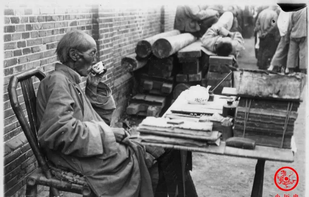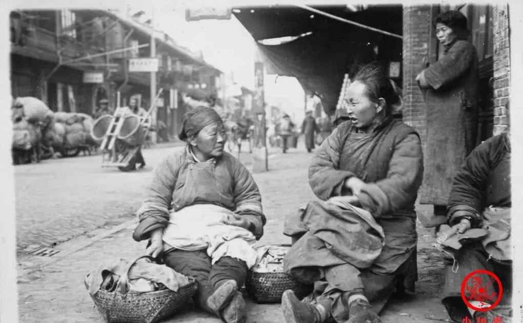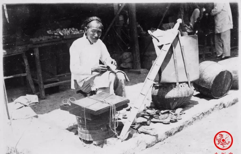 图中这位鞋匠,腰里别着一身工具,脚下摊开几双刚缝出来的布鞋,他身子前倾,手里的鞋线攥得紧实,老箱子边还搁着一把剪刀,细细绳头拖在地上,能看出来这一块砖头就是他的阵地。最扎眼的,还是他头上那根长辫子,留着前清人的老样式,在那个岁数里已经不多见了。爷爷年轻时说过,这种绑辫子的大多讲究手艺传承,他守着老法子,鞋式一成不变,耐磨抗踢,生意不算多,可一双能顶半年的脚头。现在路边再也见不到这样满是灰尘的鞋匠铺,只剩下楼底那句“穿坏了修一修”的随口提议。