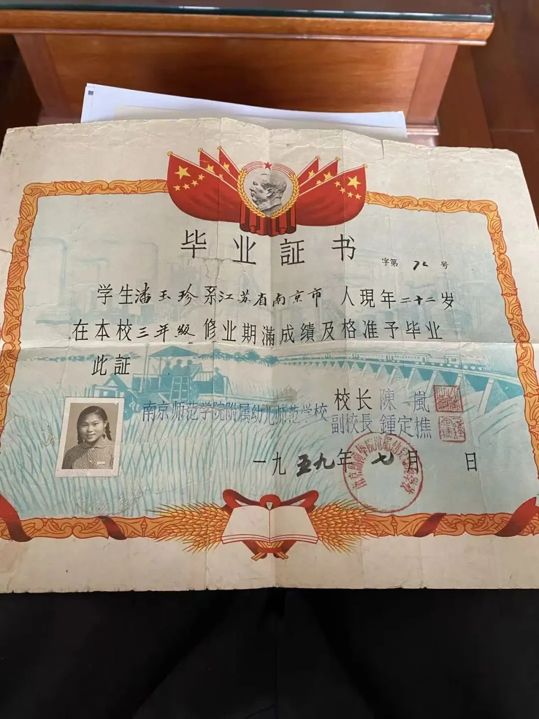 这是1959年7月,母亲从南京师范学院附属幼儿师范学校毕业时留下的印记。