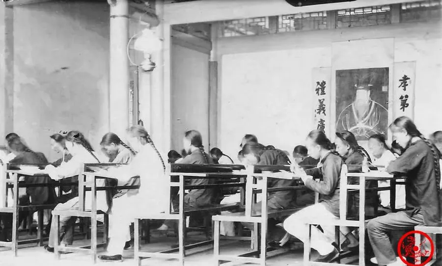 图中这教室里坐满了男学生,个顶个的脑袋后头拖着条小辫子,黑压压一片,脸朝着课本一动不动,当年的新式学堂,桌椅一字摆开,看起来还挺讲规矩,只不过每个人背后都能扫见那根辫子,书声低低,老师站讲台上,白衬衫在黑衣人堆里挺扎眼,讲个天文也好,算理也罢,讲到重点处有人翻页纸响,外头光线顺着窗口悠悠溜进来,不大明亮,但带着点子希望,印在那些年少的肩膀上也扎实。