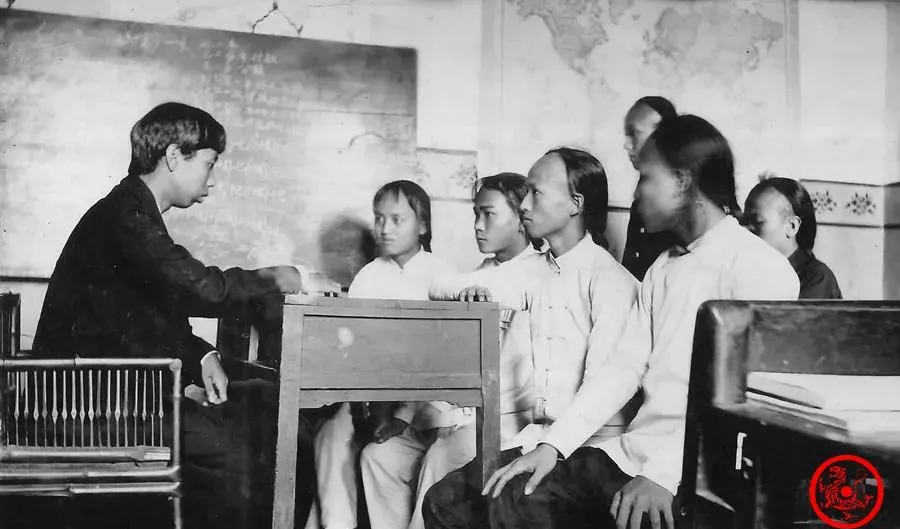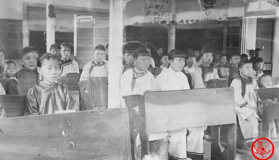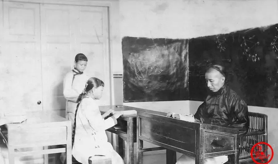 老照片:清末学堂课堂场景,男留辫子女不得裹足
