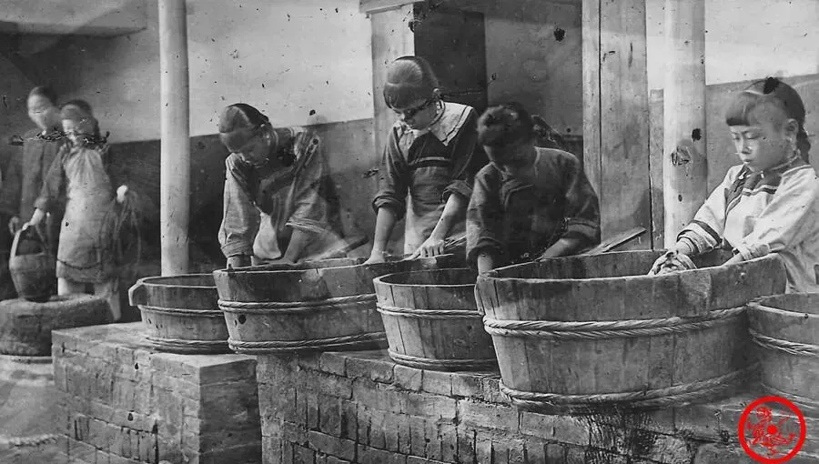 这张里头几个小姑娘围着大木盆,每人袖口挽到胳膊肘,水泡手上,动作认真带点生涩劲儿,洪水般的童子气在一屋子打旋,小时候家里老辈子总说,女娃儿进学堂能学堂里下水洗衣服,以前家里穷,女孩念书简直是做梦,现在说没啥大不了,那时能进女学堂的都是人家有点条件的娃娃,不用再裹脚,比男孩子轻快不少,一个个不怕脏累,干完还得围成一圈聊天。