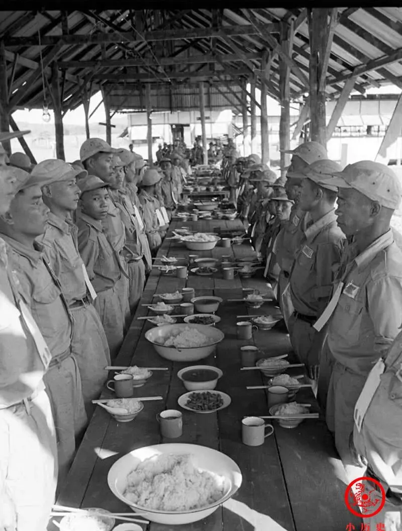 这个木棚底下一溜大长桌,两边排着站的全是国军残部兄弟,每桌并排站着、衣服上别着号牌,盘子和碗都分得刚刚好,碗里的饭菜颜色发白,有点干巴,四人共一菜一汤凑合将就,伙食没啥油水,但还能蹭口热饭。小时候听爷爷说起那种“吃饭得排队,菜汤稀得能照见人影”的场景,总觉得离自己远,但照片一出来,你就能看见“糙口粮”三个字把时光熬出了粗粝。
