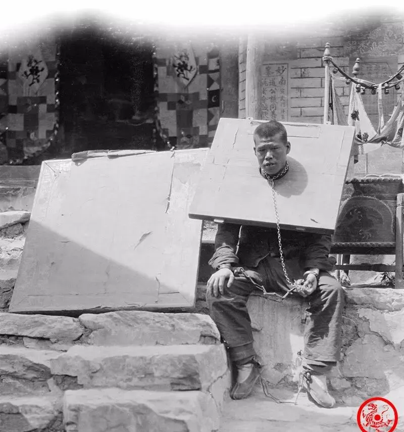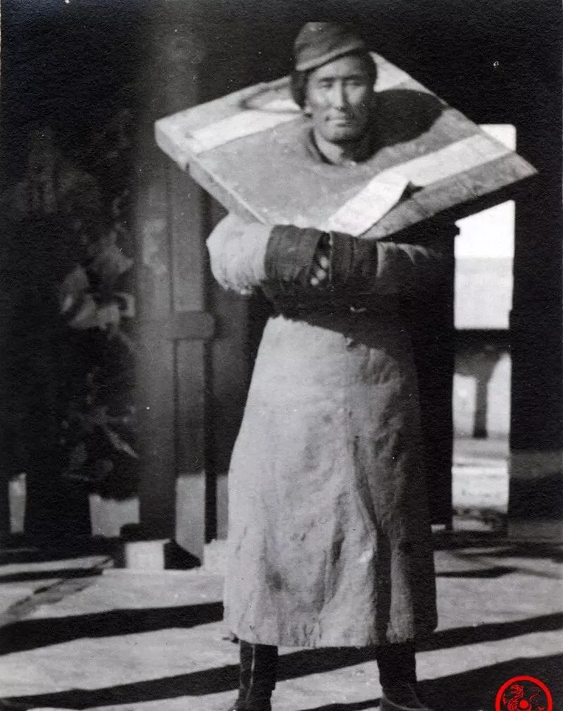图中这位,脖子上架着的叫枷锁,木头厚重,边角磨得发亮,手勉强能交叉搭着,连走路都别想快,脑袋只能低着,站久了肩膀压得直疼,天冷时这身家伙事儿麻烦透了,犯人有的坐着,有的干脆靠在墙根补觉,四周有人指指点点,北洋没少用这东西——见了枷锁,街坊背地里低声说,谁谁又出事了。
