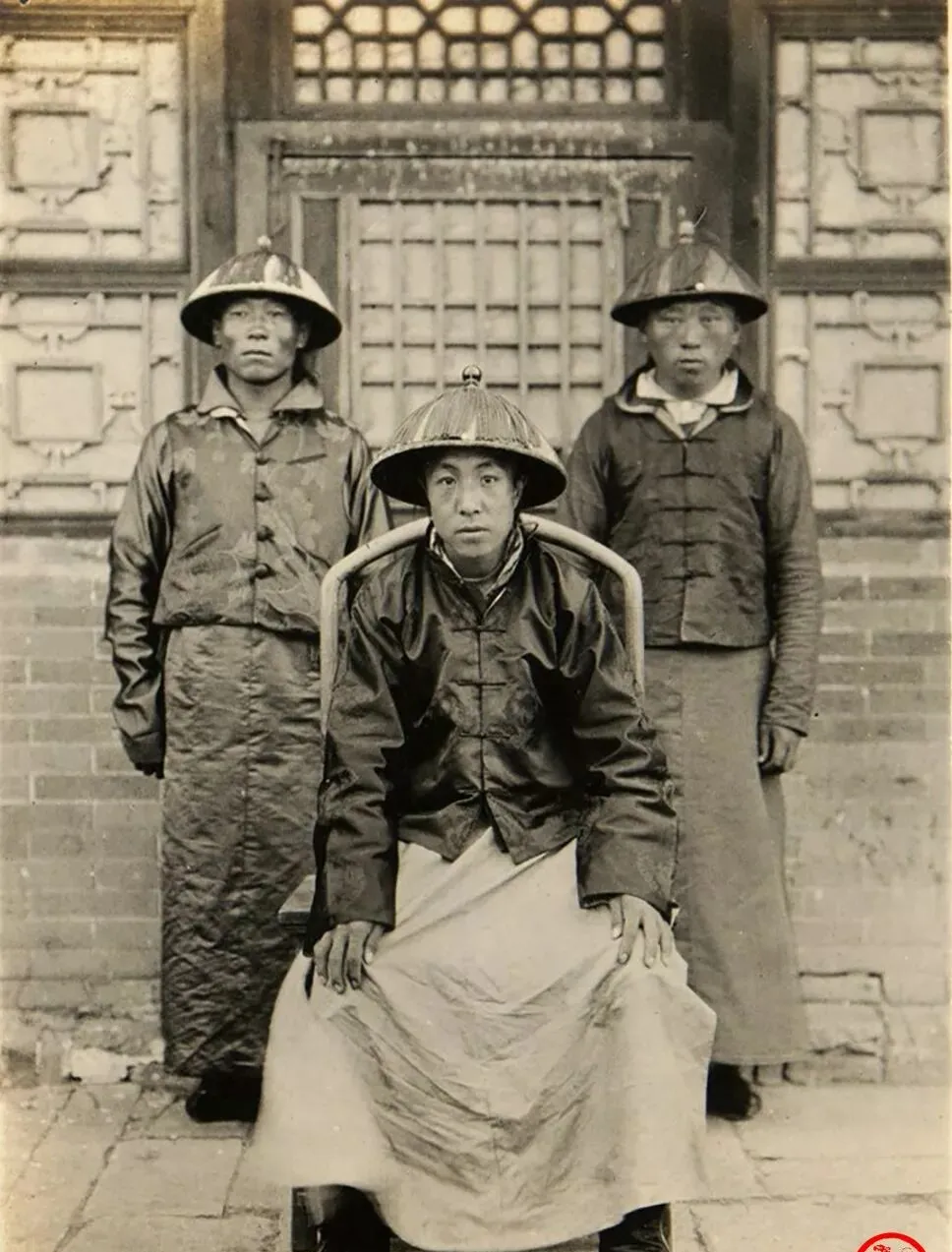 这张合影里,前面正襟危坐的穿长袍、头戴圆顶帽子的,是蒙古王族,帽顶立着装饰,袍子料子厚,光可鉴人,身后的俩侍从整齐地站着,脸上的神情跟雕出来一样,要说过去王公贵人的气派,现在凑不到一块,哪有人整天如此严整打扮,家里老人偶尔还念叨,穿这种袍子讲究规矩,从站姿到帽子朝向,都有说道。