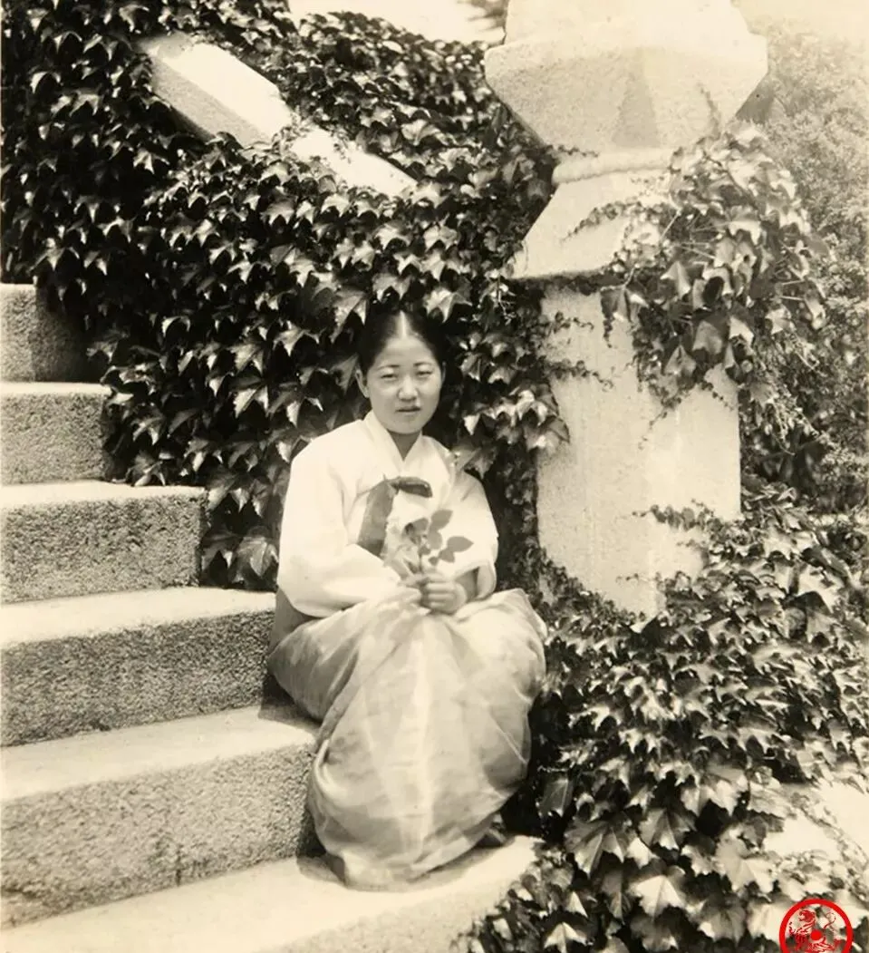 这姑娘穿着朝鲜族的传统服饰,坐在爬满爬山虎的台阶上,裙摆叠得阔,腰间一点颜色压着素白外衫,手里拢着把花,眯着眼睛轻轻笑,神色平和,环境衬着人显得格外安静,小时候街坊里偶尔有外地人来串门,不同穿戴一出来,整巷子都稀罕得很,那阵子常见的风景现在不多了。