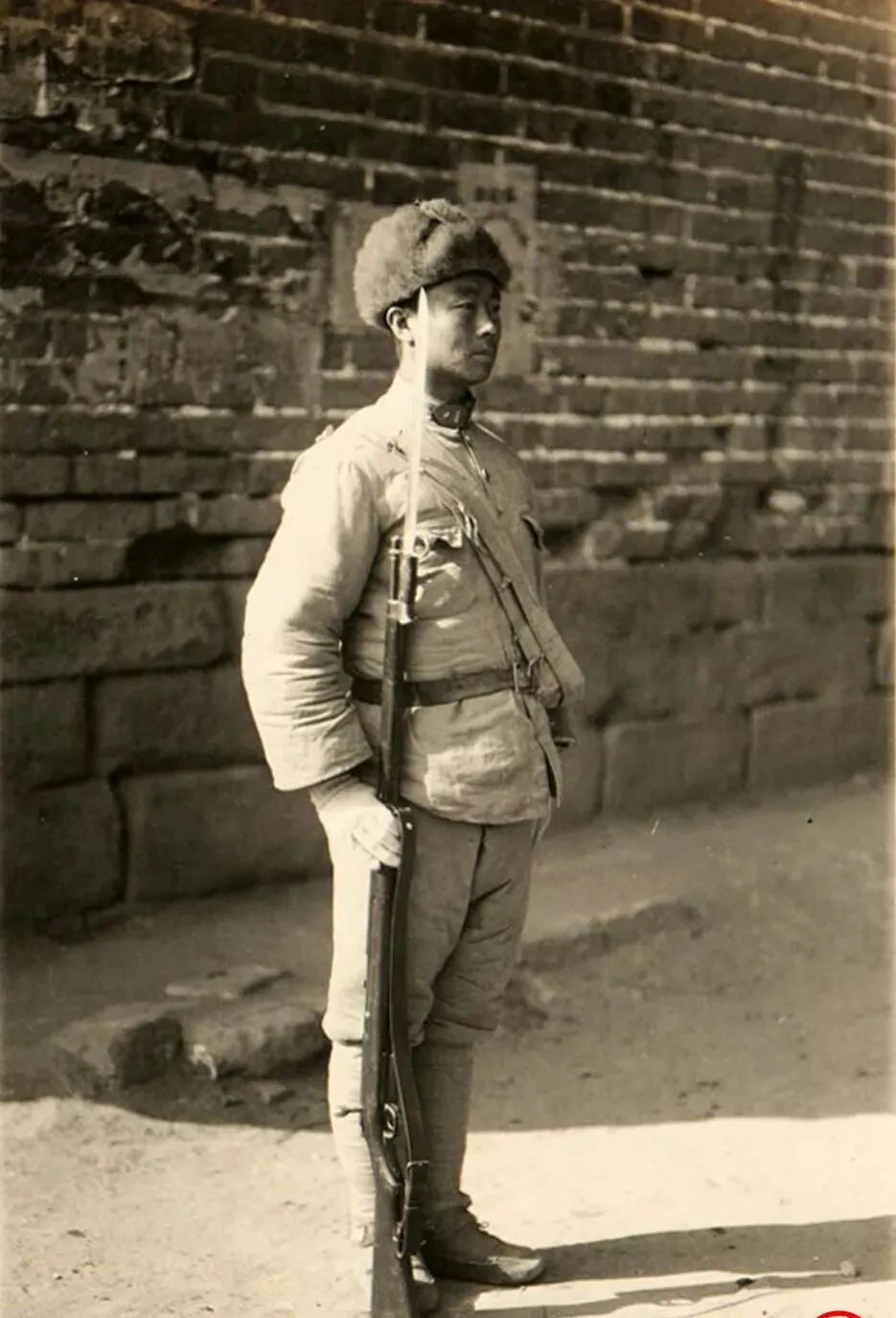 照片上这身穿厚棉衣的士兵手握步枪,顶着风站岗,帽子系得紧,腰带勒得死,肩膀上挂着什么证件,一副秒盯来往行人的样子,那时候兵多,民风紧张,有人路过就低头快走,爷爷说当年看到军装的都躲着走,有点怕生事,民间老有句话,走街串巷不惹兵。