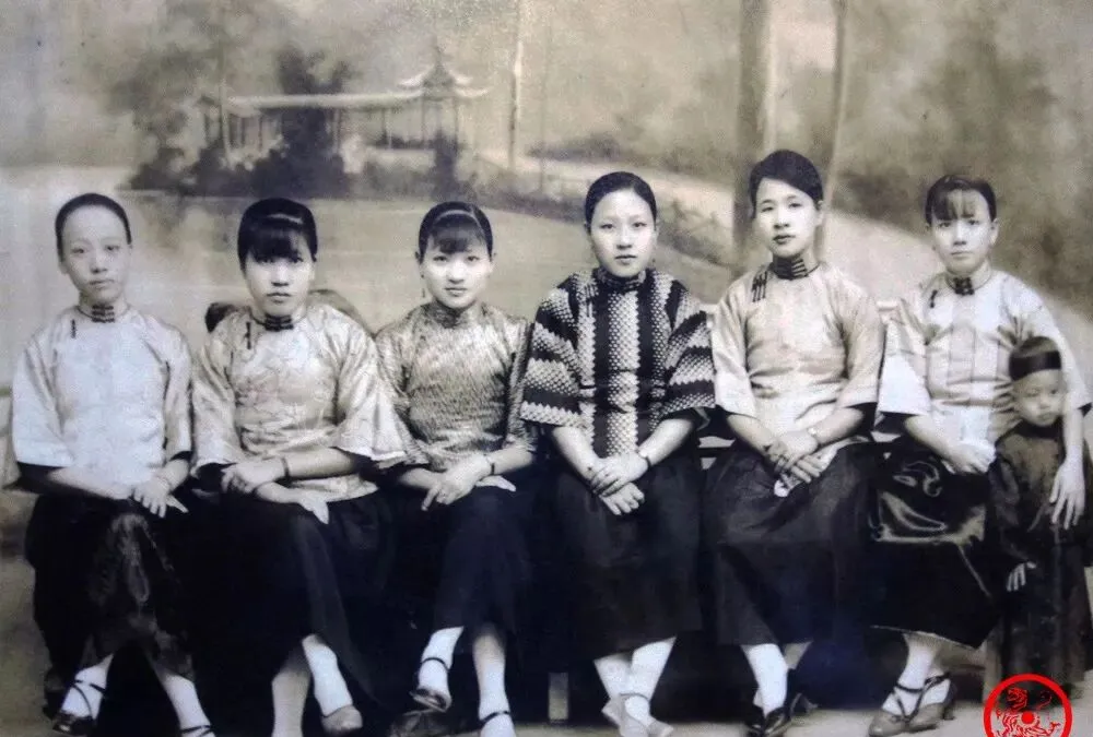 中间这组合影,要说就是我们的旧时闺女们,排排坐,梳小辫、穿绸衣,最小的一个还歪头靠着姐姐,衣料几乎一色,细看袖头和领子各有花样,大户人家讲的是整齐,照片留到今天,家里老太太有时候还认得出谁是谁,说哪个人善绣花,哪个念过书,聚一起就是一场笑话会。