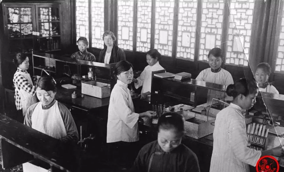 图里明亮的屋子里,一排女孩子在做实验,桌上瓶瓶罐罐,大家都穿着围裙,忙着称药、记记画画,角落竟然还有个洋老师,金陵女子大学的名气可是传得远,现在的实验室科技感十足了,那会儿光有一把天平就够稀罕,妈有次看照片犹豫半天才说,大城市的姑娘命好,乡下小孩念上书才算天大福分。
