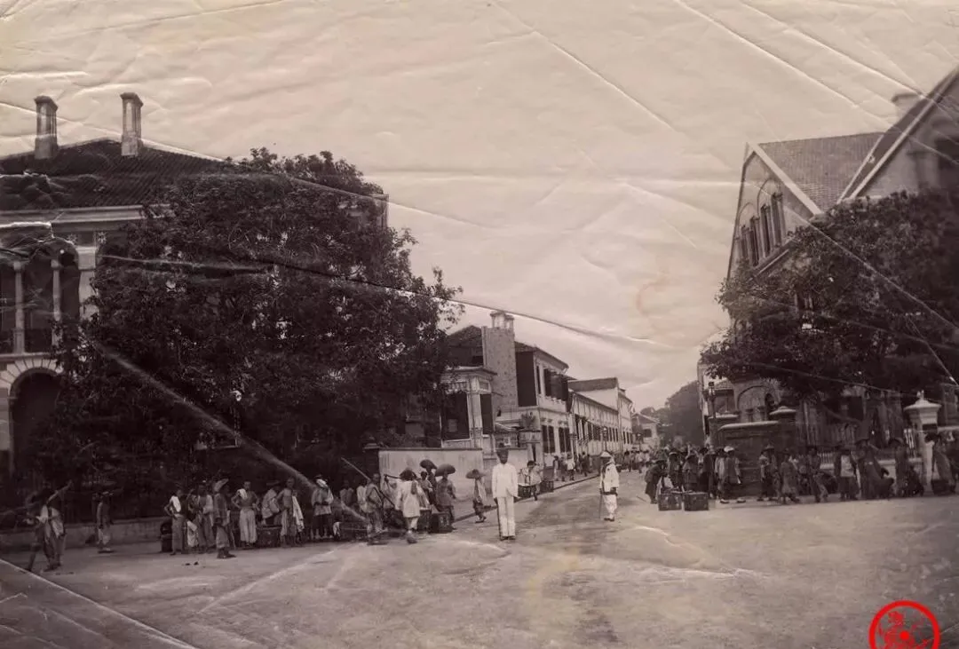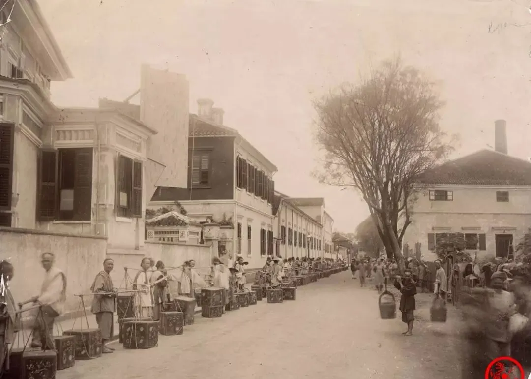 街景这张老照片,左边是洋房,右边土墙,队伍里挑茶箱的人一字排开,应该是准备把成箱的毛茶送到出口商那儿,还得经过好几道检查。街边带着草帽的大叔、扛着扁担的小伙子,背影模糊,是因为停不下来,下一个喊装车的随时插队。清廷年间,这一条街头,可以闻见东西两头交错的方言和茶叶味道,脚下踩着的全是厚土和几十年没断过的生计。
