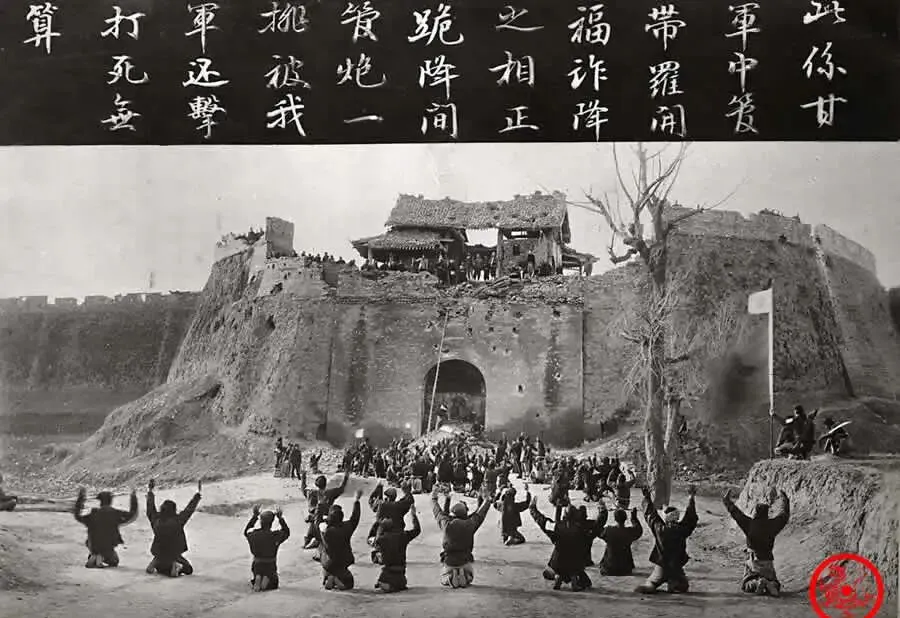 图里这一幕,就是清末甘军在乾州城脚下的阵仗,破损的城门、乱糟糟的人堆,前头跪着一排,双手举起求投降,背后的人还在观望,最上边书着密密麻麻的大字,比旁边拔开的白旗还扎眼,这叫一场空城计变了调,听家里老人说,这种场面那时候谁都怕沾边,诈降、诱敌、争锋的暗流地下翻,本来是要冲进去,占个大便宜,结果让守城的看穿了,大伙全都栽了跟头,打挺回去的时侯,外头跪着的可能就是前一分钟还喊杀声的主,真是世事一眨眼就能颠倒。