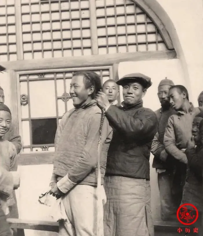 照片里笑着的男孩,头发一梳溜光,后面的人一只手攥住长辫子,一只手举着剪刀准备一刀下去,这时候清朝刚完,街头巷尾都在动手,年轻人抢着脱个干净,旁边围的人也乐呵,谁都觉得少个累赘,轻松多了,小时候听爷爷念叨过“剃头匠忙不过来,自己找家人帮着剪”,屋里地上掉了一地辫子,跑堂的小孩乐得跟过年一样,这下进学堂、扎麻花也没人管,穿个短褂子,摇头晃脑神气了一阵。