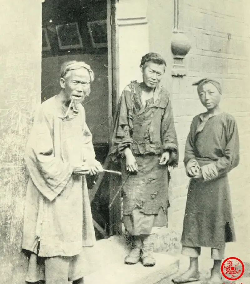 图中三个人各自倚着门槛站着,穿得破破烂烂,脸上全是风霜的刻痕,这种场面在当年城里街口司空见惯,老百姓的苦都压在身上,身上的衣服有补丁的打补丁,领口烂到胳膊肘,一根破草绳就能系住全身家当,旁边店铺老板无声地看着该干啥干啥,乞丐们咬着牙,还想再混碗饭吃,这样的日子,谁都有可能一头栽进来。