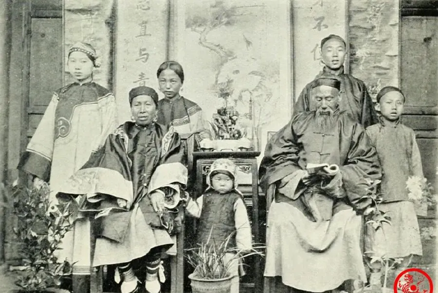 图中这一家,大人孩子都一身绸袍马褂,全家老小站左靠右,正中坐着老爷手里捏着一根烟杆,太太装珠罗袜,后头的孩子穿戴整齐,神气得很,这样的照片一看就知道家里有点门道,院子里头种着景致,一应摆设讲究得很,奶奶总念叨,那时候谁家能照张大合影都得大办一回,照片也当传家宝放着,这会儿有手机拍千张万张,哪还有那股郑重劲。