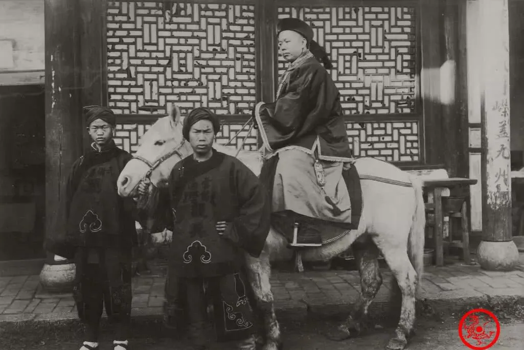 这张严格讲是那会儿身份和体面的活标本,骑在马上这位是地方上的衙门头目,两各小伙子低头牵着马,绛红长衣,绣上云纹,肥厚裤脚,脚尖掂在泥地上,墙上花格窗透进光影,官帽下面半拉脸埋着没表情,家里老人见到照片总会摇头,说以前走哪都得有排场,本身就是门脸子,哪像如今出门都是公交卡随身。