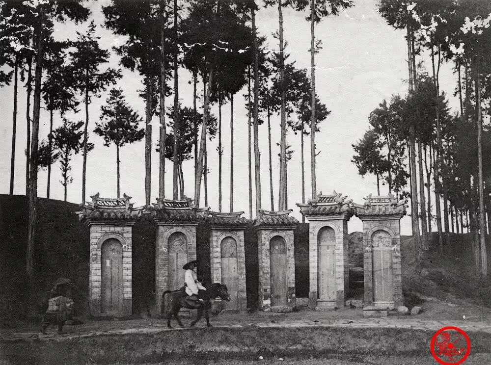 这里的石牌坊一字排开,雕花砖头全是手上功夫做的,一旁挑担人跟着骑驴的走,背影慢得像挪碎步,一排高耸的松树压着这几道门,时间在这里只剩下一点点回响,路边行人全都低着头,有地位的骑马,无名的挑担,但都被这牌坊框进了同一条路。