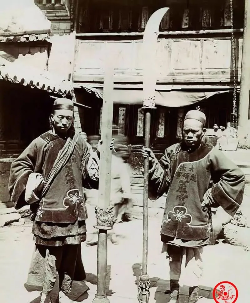 站在街口的两个差官,身上棉服外罩袍子,肩膀一沉,手里拎着比腿还长的夸张大刀,刀刃锋利晃眼,底下一撮流苏,奶奶说见着带这种兵器的人远点走,哪个敢惹衙门差事,现在大部分刀都锁进博物馆,剩下的只在这些照片里才见着了。