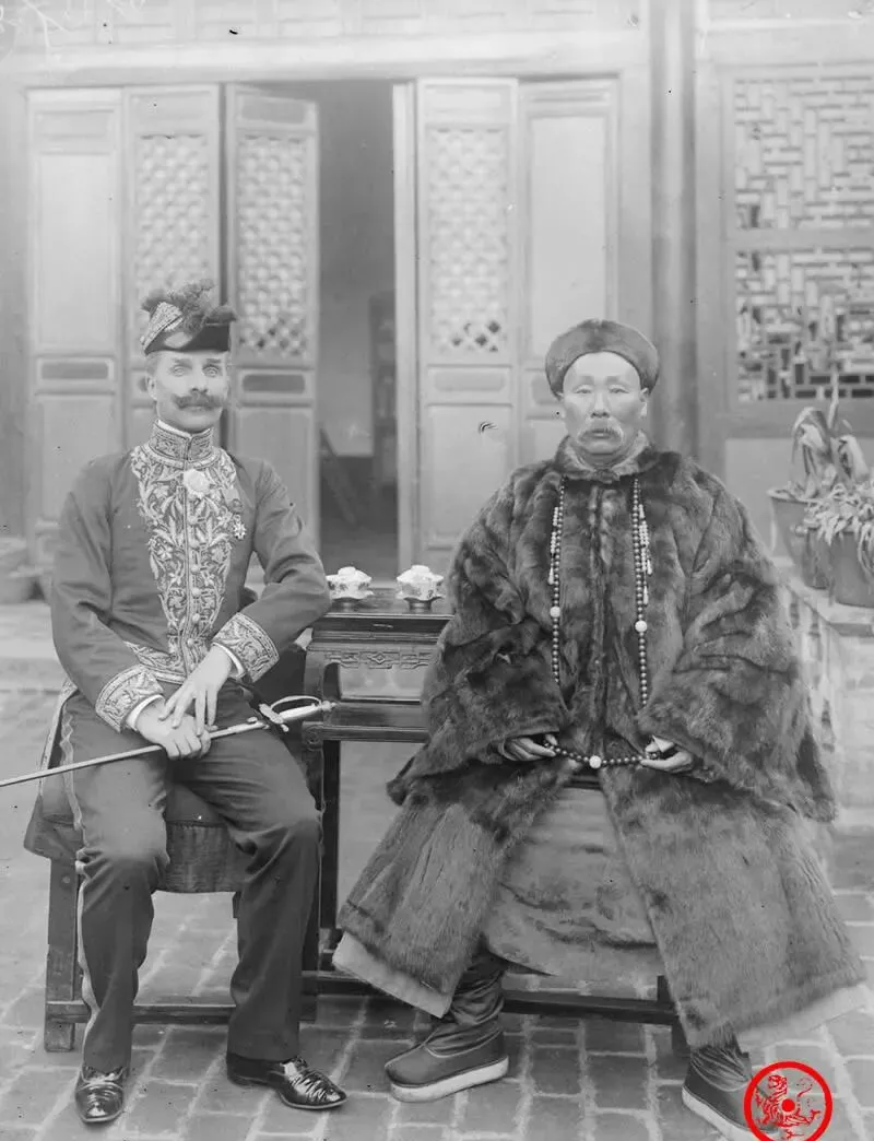 最后这张是法领事和地方大员的合影,一边是皮草长袍,一边亮闪闪的西服,桌上三只景泰蓝盖碗静静就着,一人眼神凌厉,一人微笑含糊,这里头的分量掂不出来,反正礼没有少,排场做足,现在合影都讲究靠肩贴头,那会儿谁也不让谁,风水轮流转。