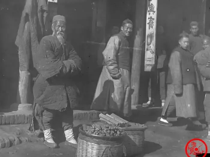 这张照片里,老人摆摊卖东西,脚边一大筐一小筐,分不清是山货还是蔬果,只瞅老头的站姿有点倔,手搭着胳膊好像天再冷也得守住这一摊子,衣服是厚的那种棉袄,裤腿绑得老紧,典型的老百姓打扮,家用货拿不完,随手扔可舍不得,拿出来换点散碎铜钱,一天能卖多少真不好说