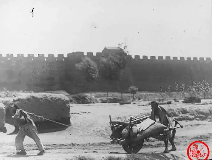 这个老物件就是独轮车,靠得住的短途运输工具,别小瞧一只轮,扛着货走烂路,那是真磨人,得两人配合拉推才稳,靠城墙边边走路颠,绳子勒肩膀,一不溜神货就歪了,活就得重来