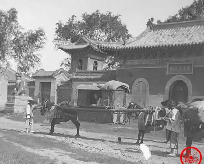 一看就知道是驮轿,牛马驴替人抬着走,外头挂着布帘,里边人坐着能冒个脑袋出来,看着新鲜其实里头挺舒服,驮轿比肩挑轿夫省劲多了,能跑得远也快,路上有牌坊庙宇,这种场面在电视剧里算是讲究了