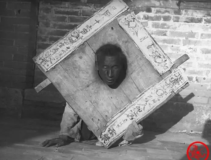 画面最打眼就是这副沉重的枷,男人半跪在地,脸黑瘦,眼里有点木,枷号大到人都架不起来,光字都写得满满当当,这活比坐牢还憋屈,脖子卡着不能翻身,吃喝都要靠别人帮衬,路过的人看热闹,他还得抬头装作不在意