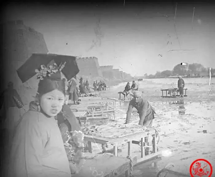 老北京的冬天结冰才算热闹,河面上都是木制小冰车,孩子们追着跑,这张照片里满族女人眉头紧锁,好像瞪着镜头问“你瞅啥呢”,气场十足,背后冰面反光整个亮闪闪