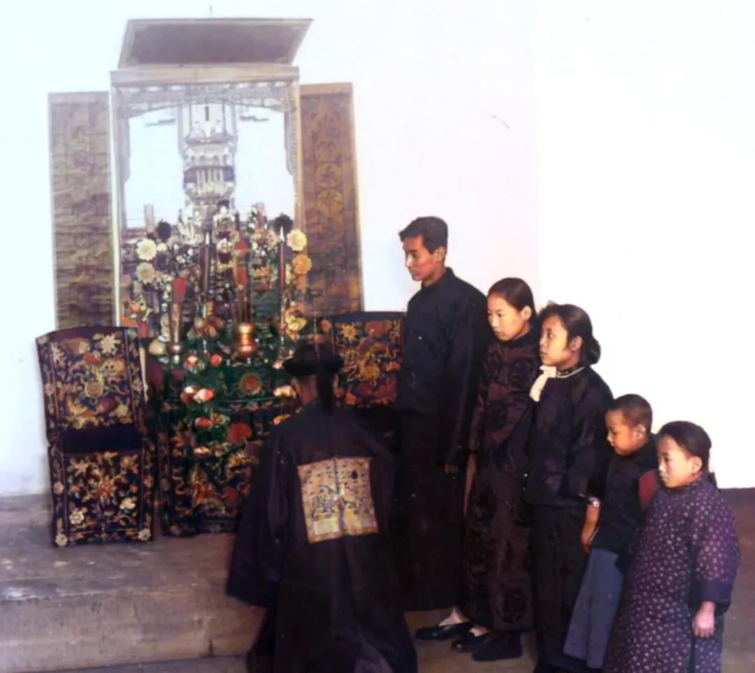 头一张,图中这一摊祖宗供案,摆得满当当,绣着纹样的坐椅、花瓶、香炉、烛台,主家穿官服跪着,一家人按辈分站成排,这种排场在村里可不是随便谁都整得起的,光那绣花椅靠,大红大紫,摸上去硬里带绵,眼睛都舍不得眨,老爷子说过,腊月二十三祭灶,一直到正月十五,头疼脑热也得撑着跪,规矩没人敢缺,桌上的黑色猪肉、饽饽塔、金银纸花,看着花哨,其实都是讲门道的,主家衣服都还穿着清代的官服,那会儿荣耀舍不得脱下,身份写在身上。