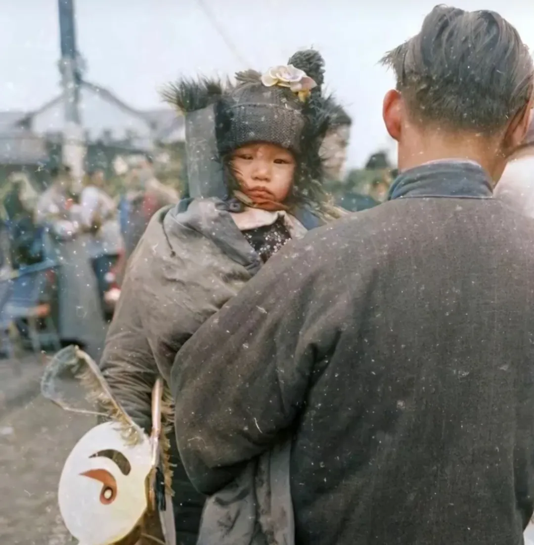 图里孩子裹得层层厚棉袄,头上戴花,脸贴着爹的后背,冻得鼻头通红,棉袄其实看起来厚,其实扑面都是碎棉条、烂棉花,没法真保暖,小时候屋里烧柴贵,靠得就是这身棉袄顶一天,爷爷曾说,这棉衣穿到最后颜色都看不清楚了,一家人能有件还能传给老小的,都得捡着大年才舍得卖,卖了棉衣身上更冷,真到年关最后,压下的就是命关,屋里没人敢生病,天一冷就能冻出祸。