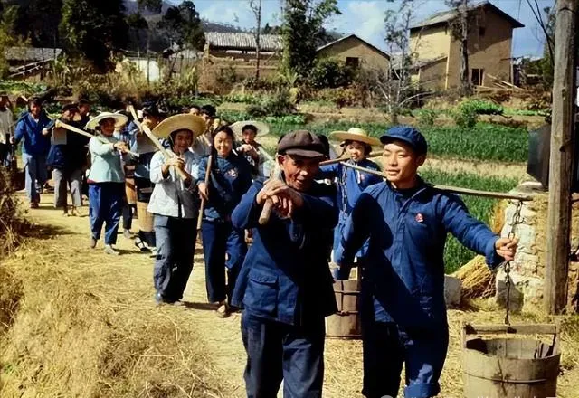蓝布衣裳、草帽、木桶排成队,肩头铁扁担一抬就是一天的活,田埂窄得要命队还没断,后面是屋顶和地头绿油油的庄稼,爸爸总说,这活都是肩膀上练出来的,苦都在脚下走出来,谁也不叨叨,现在动动水龙头一拧,现代快得不讲究滋味。