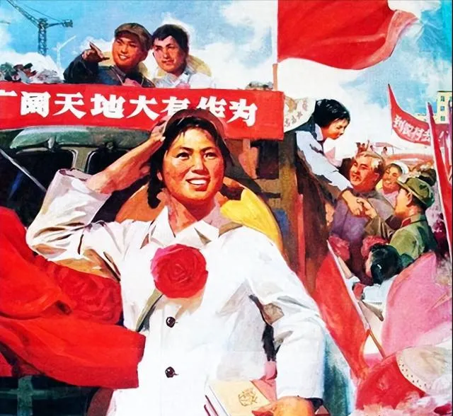 这个画面就叫人一眼认出来,红色背景大红花,标语横幅飘在半空,姑娘小伙衣服利落、表情里带着光,哪怕知道是摆拍的,精气神都真,笑容和信念扑面而来,那个年代说劳动最光荣不是口号,是大伙心里的主意。