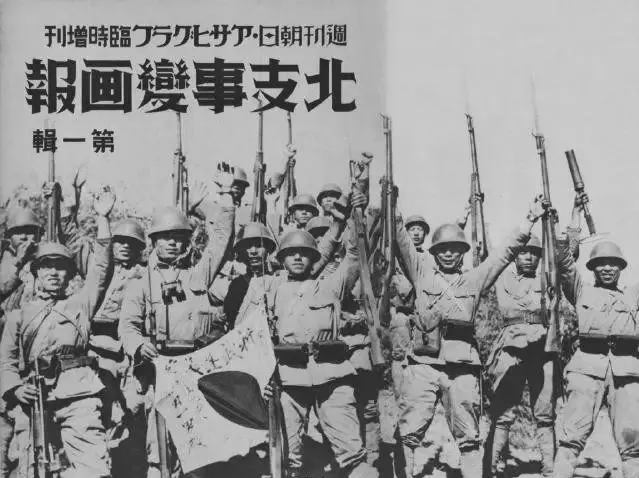 图中这张,档案里管它叫《北支事变画报》第一辑封面,站着一排穿军服提枪的日本兵,脸上全带着股子狠劲,他们高举着武器,嘴里吼着什么,那会儿流行喊“天皇万岁”,一个接一个喊得震天响,气焰嚣张,布旗子上黑字歪歪扭扭,跟后来书本上的干干净净完全不沾边,这种画报一出来,消息就传遍了日本和北平城里外。