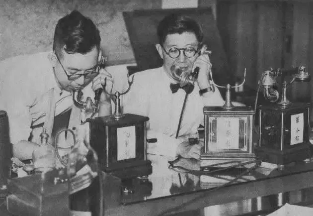 这个场面有点稀罕,档案里写着当时日本外务省东亚局的工作人员正在电话联络,两只黑色的电话摆在桌上,玻璃壳里还贴着标签,手里拿着电话筒的动作特别老式,纸笔乱七八糟堆一桌子,头顶的灯光把人影拉得老长,事发后上上下下全在忙,这种紧张劲,隔着影像都能嗅到火药味。