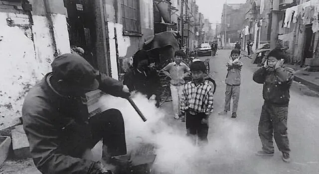 最后这个,街头打铁的画面,一老汉敲打着什么,边上小孩子全堵着耳朵,铁锤落下火星四溅,呼啦一股白烟,工具全套地摆,孩子们转着圈等着看下一招,有人喊“再打响点”,大人一笑又砸下去,这阵响,有人觉得吵,可小时候我们就觉得稀罕,那是老街巷才有的日子,岁月的味道,全都在这铁锤声里。